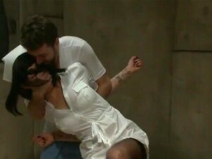 Meister spielt mit den Nippeln der gefesselten brünetten Schlampe India Summer in Zwangsjacke und peitscht sie dann nackt und im Irrenhaus
